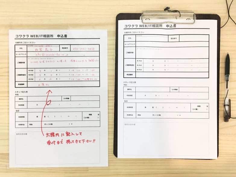 店頭に申し込み用紙もありますが上記内容を問合せから送ってもらってもOKです。