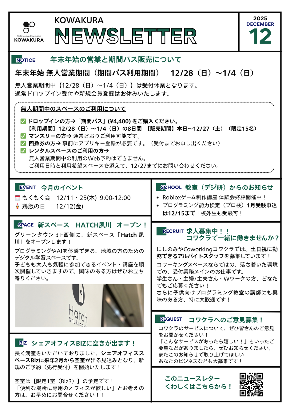 今月は、年末年始の営業スケジュールや、新しくオープンするスペースのご案内など、来年に向けたニュース盛りだくさんでお届けします✨